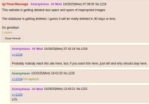 x7net's moderation team (which, according to their FAQ, consisted of the admin and his friend) deleted the sticky, and there was a small game of cat-and-mouse as anonwaha continued remaking the sticky several times. They tried to ban him (reason given: "being a retard"), but since bans were based on an ID stored in the user's browser, all it took to evade the "bans" was clearing the local storage for the site which would grant the user a new ID, LOL.